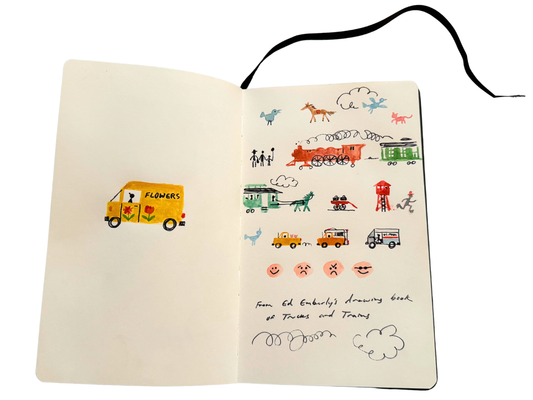 Ed Emberley. When my brother and I were little we absolutely adored the Ed Emberley drawing books. They are step-by-step guides on how to draw things the way Ed does (who by the way is about to turn 94 and is still drawing!). My favorite was the Make a World book because pretty much anything you could possibly think of was in there — you could quite literally create your own world, and populate it, and employ and house its inhabitants. My library branch doesn’t seem to have that one anymore though so I brought home Trucks and Trains. Sitting down at my desk, I took out my sketchbook and filled a page with these tiny, dear, familiar illustrations and my heart was happy.