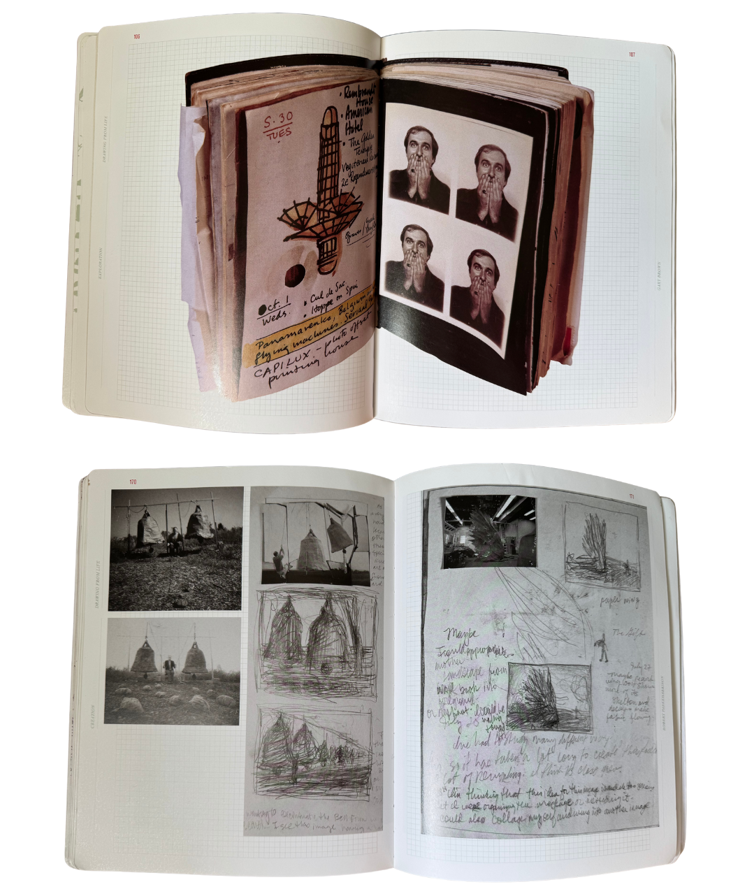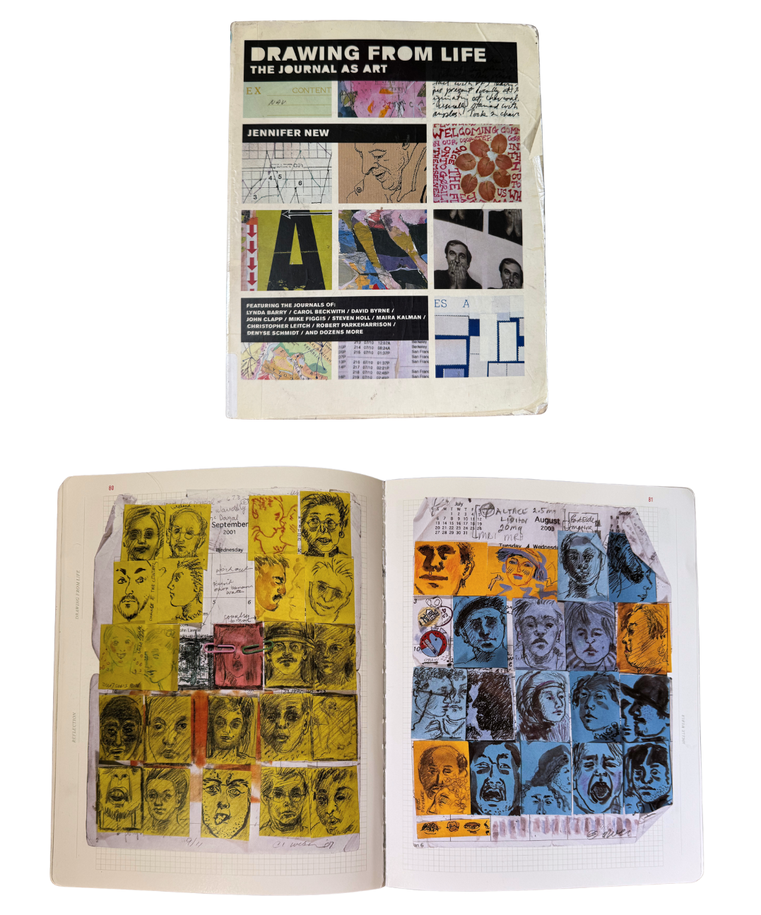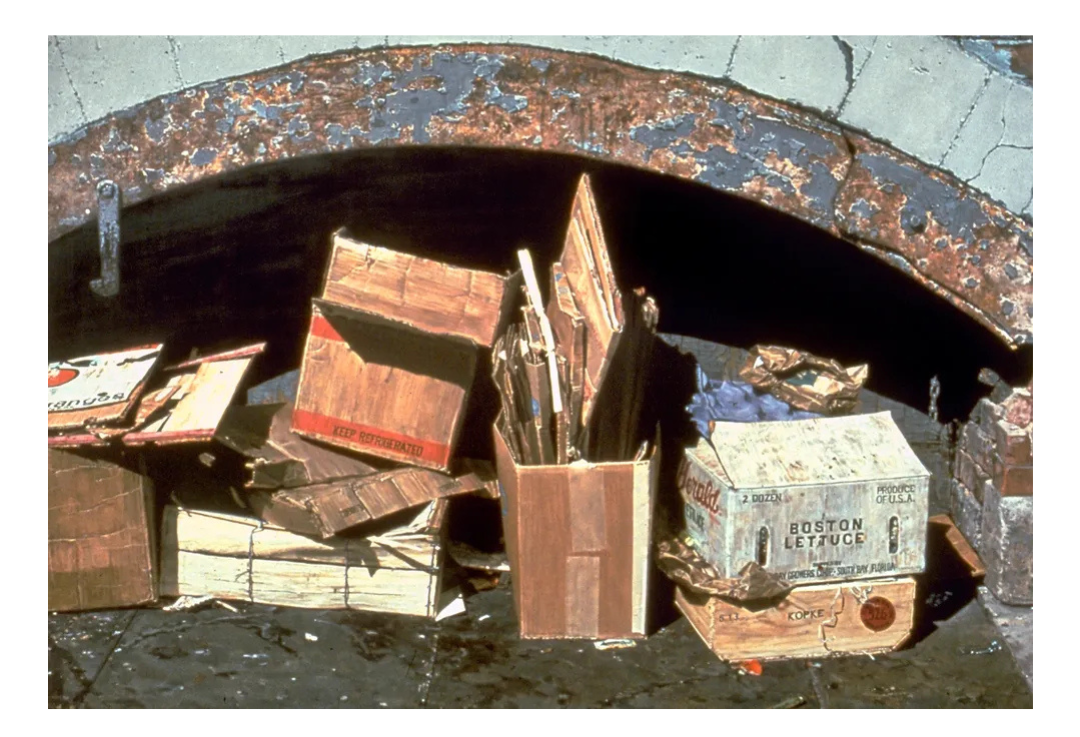 Journals as art, and a peek into the lives of others. This is a book that I discovered a while ago and went looking for again because it’s super inspiring. I don’t remember when I borrowed it last, but as I sit writing this, the open book beside me on the couch, my eyes fall on a barely perceptible transparent post-it note with a penciled underline. It shocks me to see it because I suddenly realize that it was me who put it there, so many months ago, maybe a year, to underline a Joan Didion quote in the preface. How funny to find such a note from my own past self which I had completely forgotten about tucked into a book that isn’t mine. Speaking of post-its, possibly my favorite spread in this book (which is a collection of visual journals from all different sorts of creators) is this one of Idelle Weber’s planner pages covered in drawings of faces she did on many colored post-it notes. It’s like she tiled the surface of her days in expressions. The effect is beyond interesting. My eyes linger on each drawing, then ping as if in a pinball machine from this one to that, swirling around and never losing interest. Idelle Weber created work in many styles and mediums throughout her career, including her iconic photo realistic oil paintings of trash. Looking through the catalogue on her website, one in particular of cardboard boxes captured my attention.