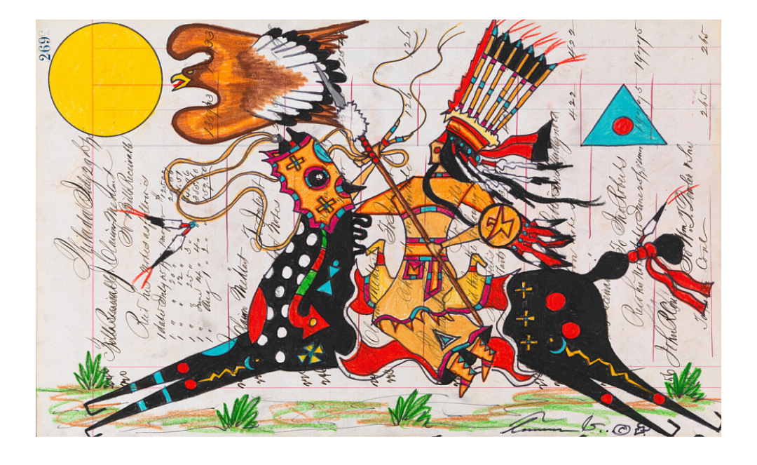 While in Washington DC last week we had the chance to go to the National Museum of the American Indian. There I learned about Ledger Art, a traditional Native American practice that began in the 1800s of using old ledger paper as a surface for drawings and paintings. There are artists who continue this practice today, such as Terrance Guardipee. His work is astonishingly beautiful. I love the interplay between background and foreground, and of course it speaks to my love for art made up of found objects and preexisting materials.