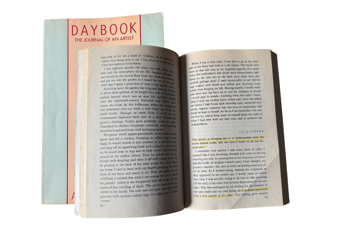 On that same long flight home during which I sketched characters from The West Wing, I also read the last few pages of Daybook by Anne Truitt. It was a book I’d been reading, slowly, for months. I was almost reluctant to finish it, because it is one of those books in which I immediately recognized myself. When I feel deeply understood by an author, instead of devouring the book I take it in smaller bites, because it feels precious and a little bit goes a long way. Truitt’s journal entries could each give me enough to think about for a week. Anyway, I wanted to share something from this book but I couldn’t decide what because I highlighted and underlined so much of it. So I opened it to a random page and my eyes fell on the phrase, “This winter is bringing me to a confrontation with the truths behind truths, like the color I know to lie just beyond color.” Are you not dying to know what she means?