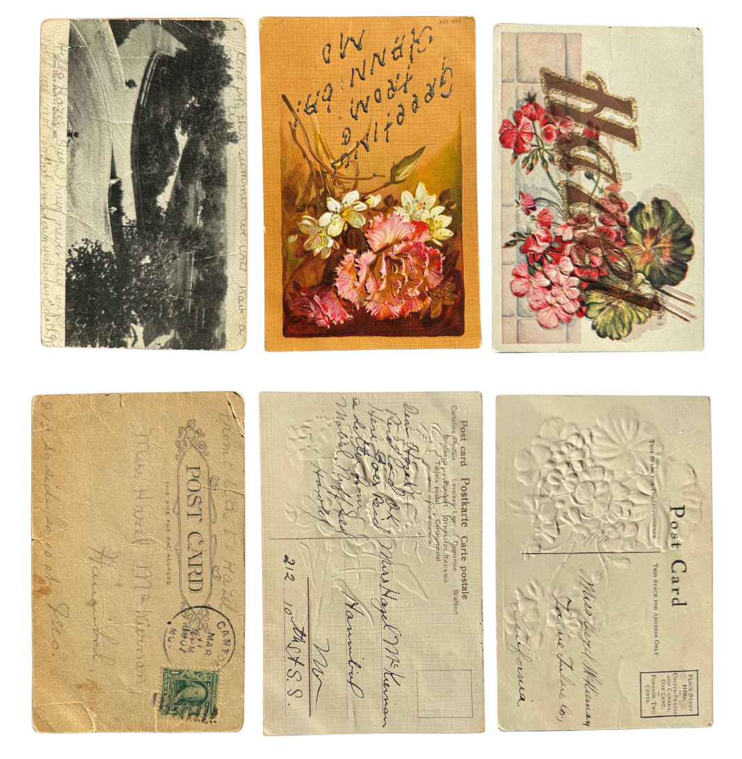 The Hazel letters. Three Edwardian era postcards addressed to a Hazel McKiernan. Apparently this was the era when sending a lovely little postcard just to say hi was all the rage. I adore the embossed ones; they feel like real petals under my fingers.